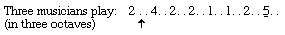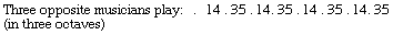 ![]() In interlocking music of this type, one musician's positive action of striking a note always coincides with a negative action, or non-strike, of his fellow musician, who at that moment lifts his beater. The effect is such that both series of equally spaced notes seem to interlock like the teeth of a cogwheel. Each of the two musicians, however, feels his own series of notes as on beat. In the very fast mangwilo xylophone music, the interlocking technique is exploited further. In some compositions by two virtuoso players, each musician interlocks with the right hand only. The left hands play different rhythm patterns superimposed over the interlocking pattern. Triple interlocking is another type, used, for instance, in Zambia in drum music and also in southern Uganda in the music of the akadinda xylophone. Here a group of three musicians plays a short pattern of equally spaced notes in parallel octaves. Three musicians sitting opposite them interlock with another pattern that fits two equally spaced notes between each note of the first group's pattern. In numerical notation it looks like this: