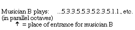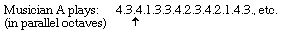 InterlockingInterlocking techniques are a prominent feature of many instrumental styles in East and southeastern Africa. From regions in Tanzania and Mozambique come the ng'oma drumming of Gogo women and such log xylophone styles as the dimbila of the Makonde, the mangwilo of the Shirima, and the mangolongondo of the Yao people. The drumming in the ngwayi dance of northeastern Zambia, the timbrh lamellaphone music of the Vute people of central Cameroon, and many other traditions also use interlocking techniques. A basic characteristic of interlocking is the absence of a common guide pulse to be taken as a reference point by all players. In a Western music ensemble or a jazz band all the players share a beat, one common metric point of departure. They may even beat their feet to mark it. While there are many traditional African musics in which such a common reference pulse does exist, in several others the musicians in a group relate their parts to individual reference pulses, which can stand in various relations to one another. In one type of relation the pulse of one performer or group of performers falls exactly in the middle of the other's pulse. This type of interlocking occurs, for example, in the music of the amadinda and embaire xylophones of southern Uganda. A special type of notation is now used for these xylophones, consisting of numbers and periods. A number indicates that a player strikes a note; the number refers to the note in the scale, as 5, for example, the fifth note of the scale. An underlined number should be read an octave down; in other words, 5 is an octave below 5. A period indicates that no note is struck. Numbers and periods both occupy one elementary pulse. The following is an example of interlocking as played on the amadinda. The melodies are actually played in parallel octaves; that is, each melody is played at the notated pitch and also at the pitch an octave below: