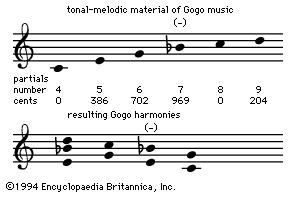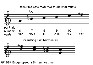 This pattern is struck on a percussion beam, and the dance style accompanying it emphasizes motions of the pelvis. The asymmetrical time-line patterns of African music are, no doubt, an ancient cultural heritage along the Guinea Coast and in western central Africa. They were most likely invented by peoples who spoke ancestral forms of Niger-Congo languages. It is likely that the area of origin was the Guinea Coast. One explanation for the absence of time-line patterns in the northern half of East Africa is that they were unknown among the first wave of Bantu-language speakers moving eastward from the Cross River area in eastern Nigeria along the fringes of the equatorial forest toward the East African lakes region circa 100400 BC. Another explanation could be the influence in East Africa of Nilotic cultures. The knowledge of time-line patterns might have been brought to western central Africa with a second migration of Benue-Congo speakers from eastern Nigeria during the Early Iron Age, a time when time-line patterns had already spread eastward across the Niger River. This second migration could have been responsible for the introduction into western central Africa of a set of cultural traits that include asymmetrical time-line patterns, the single and double bells, masked dancing, secret societies, and certain initiation ceremonies. With the beginning of the Later Iron Age in central Africa (c. AD 1000), a second nuclear area for time-line patterns apparently developed in southern Congo (Kinshasa); both the 12- and 16-pulse patterns still play an enormous role in the musical traditions of that region. With the third Bantu dispersal, this time from southern Congo and carrying with it trade connections, the practice of time-line patterns could have reached the Zambezi valley and the Nyasa-Ruvuma culture area of Tanzania, Malawi, and Mozambiquethe only areas in the eastern part of the continent where time-line patterns are prominent today. Inherent note patternsClosely associated with interlocking techniques but not necessarily depending on them is the composition of inherent note patterns. These are rhythmic and melodic patterns that emerge when series of notes in distinct intervals are played at high speed. The human ear perceives not isolated particles of sound but a gestalt. When sequences of many notes are played rapidly, the ear cannot follow each note. As a result, the hearing tends to pick out and regroup the material, forming several melodic-rhythmic patterns that seem independent of one another. Thus, the heard image of the music differs from the pattern of notes actually played. In a series of notes that are large intervals apart, for example, the ear picks out the notes of about the same pitch level and perceives them as a group. This psychological perception of a gestaltan inherent note patternis an important element in listening to and composing some kinds of African instrumental music, particularly in central and East Africa. Inherent note patterns are not accidental or coincidental; they are recognized and consciously employed by African musicians. In southern Uganda there are even specific terms referring to them. The main function of inherent note patterns is to suggest wordstext passages of a song that is outlined by instrumental accompaniment. Thus, in the music of the ennanga harp of Uganda, the inherent note patterns suggest certain phrases of the vocal part. In a performance of the traditional harp song Olutalo olw'e Nsinsi (The Battle of the Nsinsi) by the former court musician Evaristo Muyinda, one inherent pattern seemed to speak the words Batulwanako ab'edda! (How They Forget Those Ancients!) long before they were actually sung. Muyinda often introduces a new phrase of text by first accentuating the corresponding inherent rhythm on the ennanga. Once the melody is firmly established as a gestalt, it is sung. By slight accentuation or melodic variation during performance, the harpist may bring one or another of the already existing inherent patterns into prominence. This results in a musical development of the song's text. Tone systems and multipart patternsTone systems and multipart patterns have a functional interrelationship in African music. In other words, the kind of multipart pattern occurring in singing or instrumental music is conditional on the type of tone system, and vice versa. The tonal material used in African musical traditions varies considerably from region to region. Tonal organization, tuning procedures, and intervallic structure depend upon a broad range of human experience. Several factors have determined the shape of tone systems actually in use. One factor mentioned above (see Musical instruments) is language, especially with regard to the semantic and grammatical importance of speech tone. Another is the principle of equidistance, the measuring of space or time in equal steps. In addition, in some cross-perceptual associations, such as from aural to visual and vice versa, pitch may be graded in terms of magnitude or altitude. In African music different pitches are not conceptualized as high or low, as they are in English and some other Germanic languages of Europe, but as small and big or tiny and fat. Consequently, a lamellaphone of middle size, producing middle-range notes, is called endongo in Lusoga, a Bantu language spoken in an area of Uganda east of the former kingdom of Buganda. Kadongo (with the diminutive prefix ka-) is a high-tuned lamellaphone, while gadongo (with the augmentative prefix ga-) is a bass instrument. Finally, tonal structure may be influenced by the human experience of sound in nature and the discovery of acoustics. Broadly speaking, African tone systems may be divided into the following families and subfamilies: (1) equi-tonal systems, based on the principle of equal intervals, (2) monophonic systems, based on octaves, fifths, and fourths, and (3) systems based on the experience of instrumental harmonics. Equi-ton