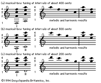 ![]() Tone systems based on the use of harmonics from two fundamentals are frequently encountered in areas where the musical bow, particularly the mouth bow in its varieties, is or was an important instrument. Western central Africa and the whole of southern Africa are the most prominent distribution areas for mouth bows; they are also found in some areas of West Africa. The tone system of the !Kung people is tetratonic. It may manifest itself, however, in three different versions with different intervals, leading, as in the first of the tunings shown below, to a semitone interval (shown as FE). Because the melodic and harmonic results of these particular tunings are unique, they provide strong evidence of San heritage in any southern African music in which they occur. In !Kung music the natural harmonic series of each fundamental is not used beyond the fourth partial. This is why fourths, fifths, and octaves are the characteristic simultaneous sounds in !Kung polyphony.