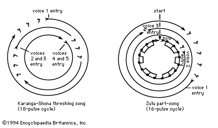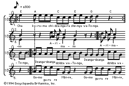 ![]() Multipart singingMultipart singing and harmonic concepts are basic traits of many African musical traditions and have been observed by Western travelers since the earliest periods of contact. Contrary to earlier opinions, harmony in African music is now seen to be not a result of acculturation but rather indigenous to many parts of the continent. Polyphonic singing styles were almost certainly used by prehistoric hunters in central and southern Africa. Among the San, the discovery of the use of the hunting bow as a musical instrument, and with it the discovery of the harmonics of a stretched string, constituted a cluster of traits that were probably interdependent. Questions raised in the 19th and early 20th centuries as to whether the hunting bow or the musical bow was invented first are certainly irrelevant in the culture of southern African prehistoric hunters. Multipart singing in African music embraces two entirely different approaches, homophonic and polyphonic, with the definition of these words adapted to African cultures. Homophonic vocal stylesIn these styles all melodic lines, though at different pitch levels, are rhythmically the same, and they begin and end together. Individual singers conceive of their voice linesall carrying the same textas identical in principle, only sung at different levels. Men sing with a big voice (i.e., in low voices), women and children with small voices (i.e., high voices). Their voices may stand a third, a fourth, a fifth, or an octave apart, but they are considered to sing the same tune. In practice, though, not only parallel but also oblique and contrary motion may occur. To what extent the latter is permitted depends upon the tolerance within the tonality of the particular language. For example, in eastern Angola contrary motion is normal practice. In other cultures movement is strictly parallel within the structure of the tone system concerned. Homophonic multipart singing is found in particular concentration along the Guinea Coast. It is also found throughout western central Africa, among most peoples of Angola, Zambia, and Malawi, and in many parts of East Africa. In northern central Africa it is found among the Zande and related peoples. In southwestern parts of the Central African Republic there is three-part harmonic singing with vocal parts shifting chromatically between two roots one semitone apart. Homophonic vocal styles are often linked to a call-and-response (leader-chorus) form. Polyphonic vocal stylesIn these styles the complementary individual lines differ in their rhythm and phrasing and carry different texts or syllables. They may be of different length, and their starting and ending points do not coincide. Such styles are more restricted geographically. The vocal music of the San communities in southwestern Africa is predominantly polyphonic, as are the vocal styles of Bambuti in the Ituri Forest and the pygmy groups of the upper Sangha River area of the Congo and the Central African Republic. (The San and pygmy peoples, whose polyphonic styles and tone systems are based on different principles, have often mistakenly been lumped together in evolutionist theories.) In other parts of Africa, isolated islands of polyphonic singing occur among or between largely homophonic communities. Thus, the otherwise homophonic Gogo people employ polyphonic techniques in their saigwa and msunyunho songs, and Nyakyusa children of southwestern Tanzania use yodel and polyphony in a song type called kibota. A distinct style of polyphonic singing is found in much of the music of the peoples of the lower Zambezi valley, in parts of Mozambique, and also in Zimbabwe, as exemplified by the Karanga-Shona threshing song shown here: