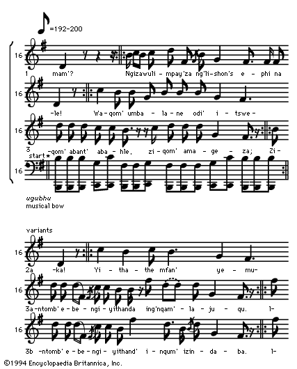 ![]() All the vocal music considered above has as its basis some kind of tone system. Among the Zulu and other Nguni peoples, however, certain non-melodic forms of chanting coexist alongside melodic styles of performanceeven among items that fit the same category of dance-songjust as some English nursery rhymes are sung while others are recited or chanted. In such cases, fixed musical pitches are absent, and a singsong form of rhythmical recitation is used instead. The close affinity of such pieces with melodic songs is confirmed by their sharing of the same circular, multipart formal structure. There is indeed evidence from many different parts of Africa of the use of intermediate vocal styles, falling somewhere between the extremes of speech and song. In many African cultures the boundary between the two does not tally exactly with the Western, demonstrating that definitions of music and song are culture-specific. Donald Keith Robotham Copyright © 1994-2005 Encyclopædia Britannica, Inc. |
