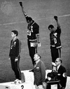 American track medalists Tommie Smith (centre) and John Carlos raising black-gloved fists at the